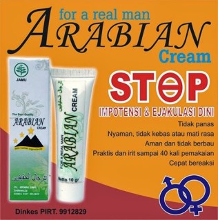 Arabian Cream adalah formulasi antara berbagai macam minyak atsiri, blackstone dan ekstrak gambir serawak (borneo cats claw) yang berfungsi untuk menunda ejakulasi dini pada berhubungan suami istri.