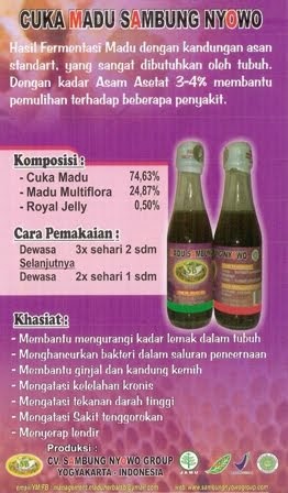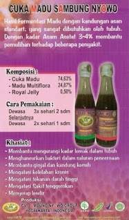 Hasil fermentasi madu dengan kandungan asam patentonat yang standard untuk stimulan metabolisme darah dalam tubuh, dengan kadar asam asetat 3 – 4% sangat membantu untuk :