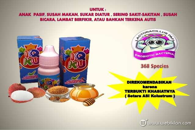 IQ-KU merupakan formula perpaduan antara beberapa herbal, yaitu madu,gula aren,pegagan yang menurut hasil riset berbagai ahli herbal amat bagus untuk asupan nutrisi untuk bayi dan anak-anak. IQ-KU juga mengandung probiotik yang amat bagus untuk membantu pertumbuhan dan perkembangan sel-sel tubuh, terutama sel-sel otak anak bayi dan anak di masa pertumbuhan. Pertumbuhan sel itu dimulai sejak bayi berumur 3 bln dalam kandungan ibu, sampai pada usia 12 tahun. Di masa-masa inilah perkembangan maksimal sel tubuh dan otak terjadi. Setelah usia 12 tahun mengalami perlambatan.