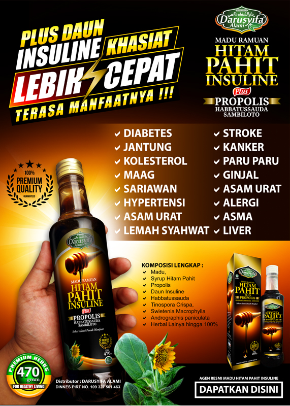 Madu Hitam Pahit Insuline adalah ramuan dari berbagai jenis herbal pilihan yang efektif membantu proses penyembuhan berbagai penyakit baik ringan maupun berat, pengobatan serta pencegahan.