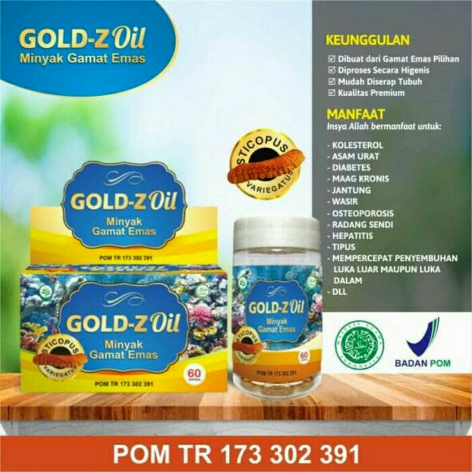 Gold-Z Oil adalah produk spektakuler merupakan kapsul minyak gamat emas pertama yang diproses dengan teknologi canggih sehingga menghasilkan minyak gamat emas berkualitas yang dikemas dalam kapsul sehingga praktis untuk dikonsumsi.