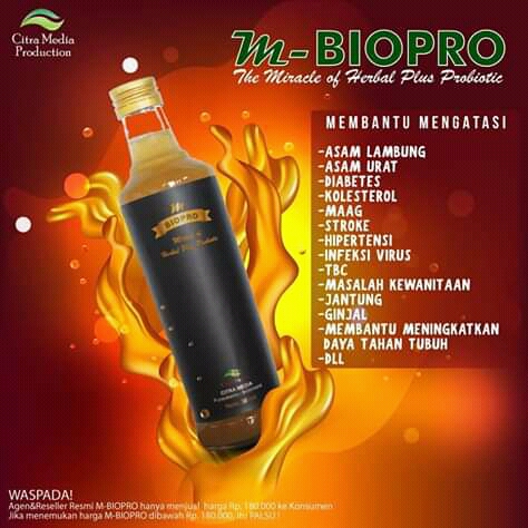 M-BIOPRO adalah Formula Fermentasi Herbal dengan kandungan bakteri baik (probiotik) untuk menjaga kesehatan tubuh manusia. M-BioPro dibuat dari bahan-bahan alami yang kaya manfaat antara lain: -Air Kelapa -Tumbuhan Sarang Semut -Akar Pepaya -Daun Ketepeng -Ekstrak Kulit Manggis -Madu -Propolis -dll Ramuan herbal ini diekstrak dan difermentasi dengan aktivator bakteri baik (Probiotik) yang sangat bermanfaat bagi tubuh kita untuk kebutuhan kesehatan dan pengobatan penyakit. M BIO PRO Halal dan Legal.