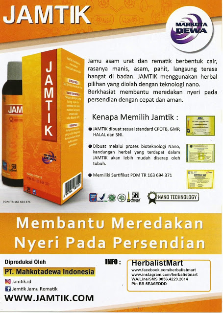 - JAMTIK Jamu Reumatik Nyeri PersendianJamu Reumatik berbentuk cair, rasanya manis, asam, pahit, langsung terasa hangat di badan.JAMTIK Jamu Reumatik Nyeri Persendian,di olah dengan teknologi Nano dengan fermentasi, menggunakan herbal pilihan. Berkhasiat atasi reumatik/rematik dan turunkan kadar asam urat dengan cepat dan aman.JAMTIK Jamu Reumatik Nyeri Persendiansebuah terobosan terb